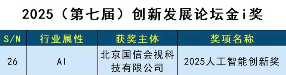 全国企业新质生产力赋能最佳典型案例评选,聚焦于以创新驱动发展、为行业注入新动能的标杆项目。国信会视设备全生命周期智能运维平台脱颖而出,意味着其已成为新质生产力落地实践的典范。而2025第七届创新发展论坛的人工智能创新金i奖,作为行业内极具权威性与影响力的奖项,更是对国信会视在人工智能领域创新突破、成果应用的最高褒奖。双奖加持,是实力的印证,更是对国信会视未来发展的有力背书。