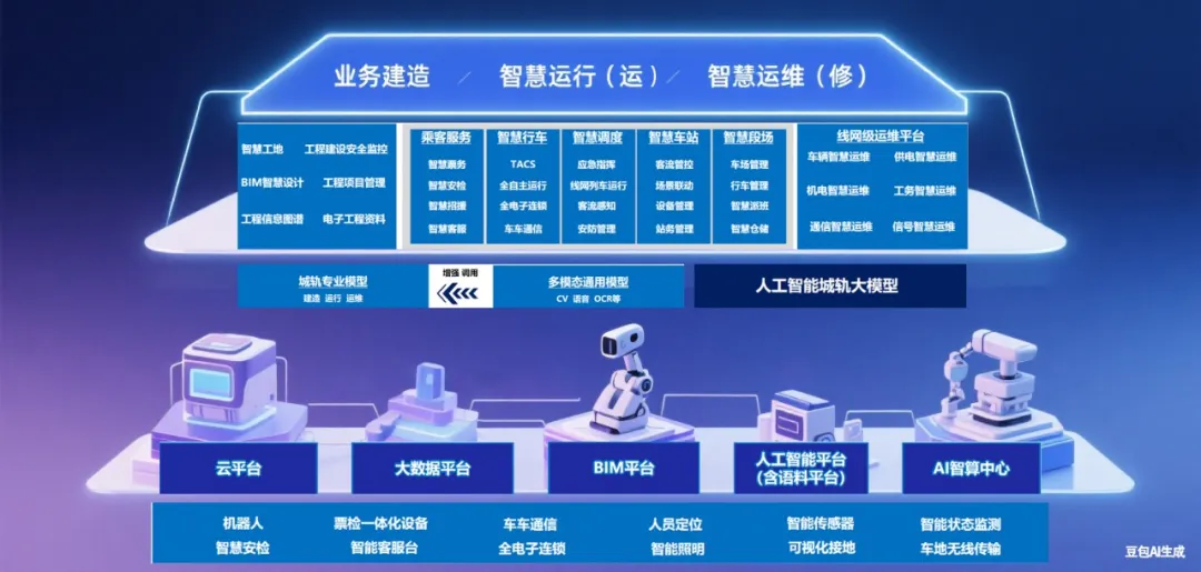 人工智能应用解决方案定位为以 “智慧大脑” 技术架构为核心引擎,驱动全产业链智能化变革的关键支撑。其依托GPU服务器、算力中心等硬件底座,构建覆盖基础大模型、数据管理及训推平台的全栈技术体系,深度融合智慧运行、建造、运维等场景,通过算力调度、数据标注等平台能力实现全流程智能化赋能。核心价值在于AI算法与专业模型结合实现设备故障预测与健康管理,依托RAG知识库与Agent智能体优化客流管控、智慧调度等流程,降低运营成本;推动行业向全生命周期智能高效安全转型,夯实智慧轨道交通底座。